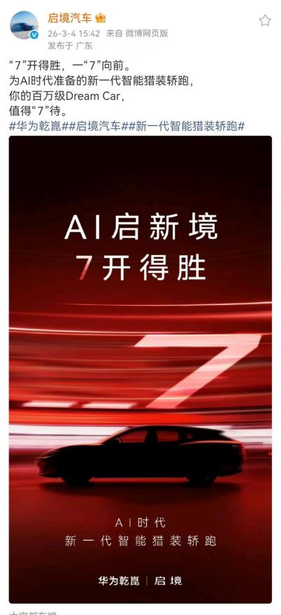 发布会结束后,启境汽车发布了一个有“7”的海报,还配文“一7向前”,预计这是打算携手尚界Z7和Z7T,首款车也要命名“7”的节奏?
