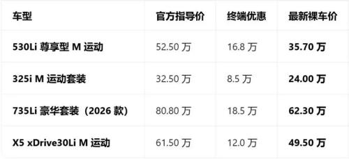 宝马5系、3系、7系和X5等主销车型的优惠幅度也达到了8万以上,其中530Li尊享型M运动版最高优惠达到了16.8万,裸车价最低35.7万,降幅超过了30%。