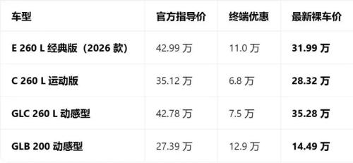 根据最新的终端价格信息,奔驰的主销车型E级、C级、GLC、GLB都有6万以上的优惠幅度,其中GLB 200动感型优惠达到了12.9万,裸车价不到15万即可入手。