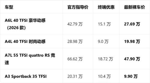 奥迪A6L、A4L、A7L、A3等车型则有9万以上的优惠,A3 Sportback 35 TFSI的优惠达到10.4万,部分门店不足10万就能买到这款入门级的紧凑型豪华轿车。