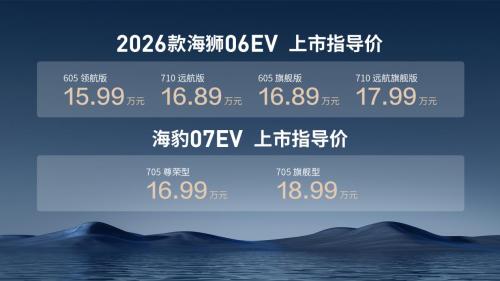 此次上市的2026款海狮06EV与海豹07EV,定价分别瞄准15.99万元- 17.99万元、16.99万元- 18.99万元的主流新能源市场区间,