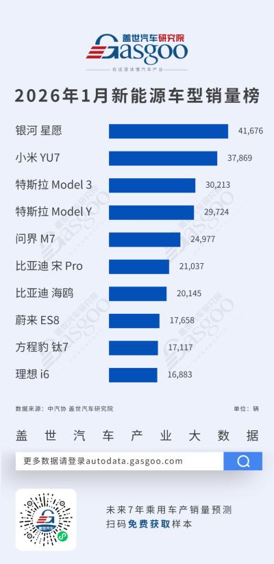 2026年1月新能源车型销量榜单中,银河星愿以41,676辆的成绩位居首位,小米YU7以37,869辆排名第二,两款车型月销量均超过3万辆,显示出自主品牌在新能源市场中的强劲竞争力。特斯拉Model 3、Model Y分别以30,213辆和29,724辆位列第三、第四位,保持稳定的市场表现。整体来看,头部车型之间的销量差距并不显著,市场竞争持续加剧。