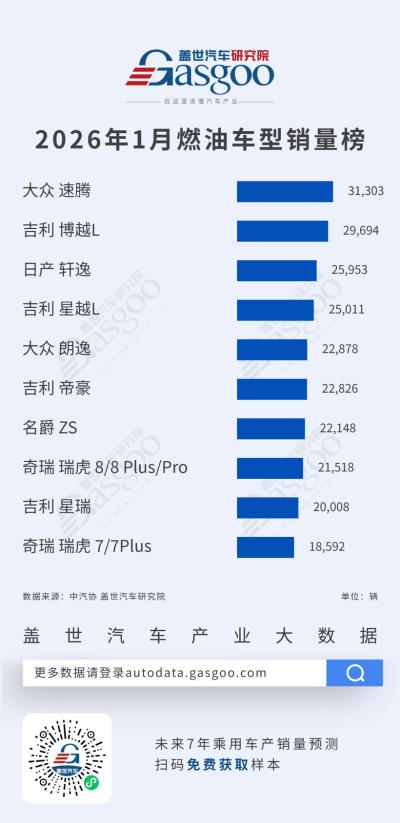 2026年1月燃油乘用车车型销量榜