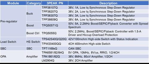 根据不同储能电源对充电电流大小需求不同,思瑞浦可提供丰富同步车规Buck产品,包含1A/2A/3A的TPP36x07Q和6A的TPP36609Q,输入电压支持3~36V范围。其中TPP36x07Q具备超低(6uA)静态功耗,TPP36609Q具备200kHz ~2.2MHz可配置的开关频率,以上型号均支持展频输出,为汽车应用环境降低EMI风险。