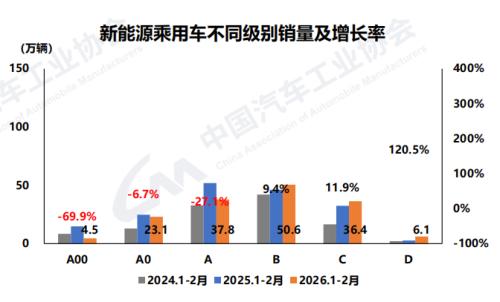 需要注意的是,在传统燃料乘用车中,销量最集中的A级车型,1-2月累计销量107.9万辆,同比下降8.4%。反观新能源乘用车,A00级~A级销量均呈不同程度下降,目前销量主要集中在B级,累计销量50.6万辆,同比增长9.4%。这表明消费者在新能源领域更倾向于中高端、长续航、智能化的产品,市场结构正在从“政策驱动”向“产品力驱动”升级。