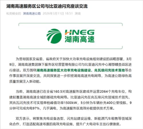 湖南高速公路官方公众号日前发文称,3月9日,湖南高速集团旗下服务区经营管理有限公司与比亚迪闪充中心湘鄂赣贵战区进行座谈。