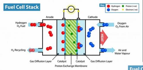 氢气通过左边蓝色的负极,被催化剂“铂”分解成电子和氢离子(质子),质子继而通过中间灰色那块的质子交换膜(电解质膜),到达右边绿色的正极,氢与氧反应变成水和热量。
