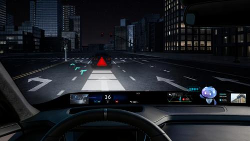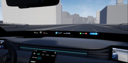 经纬恒润P-HUD具备36°×2°超大视场角,形成从A柱到A柱的贯穿式超宽显示区域,主驾副驾可以同时观看。通过特殊光学设计,显示内容"悬浮"在前方约1.1米处,营造出自然的空间纵深感。