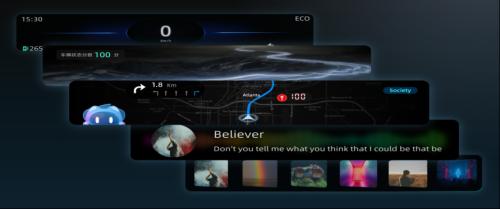 P-HUD以三区相连的全景显示布局,构建全新的沉浸式驾驶体验和视听享受:左侧驾驶核心区,投射车速、里程等关键仪表信息,相较传统的仪表屏,位置更接近驾驶视野,大幅缩小驾驶员视线转移幅度,保障行车安全;中间和右侧智能交互区,用户可自由选择搭配导航、娱乐等功能卡片,随心切换视觉风格,尽情享受科技赋能的座舱视听盛宴。