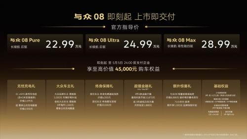 4月16日,金标大众品牌首款全尺寸纯电SUV——与众08正式上市。新车提供Pure、Ultra、Max三个版本,官方指导价22.99万元至28.99万元。