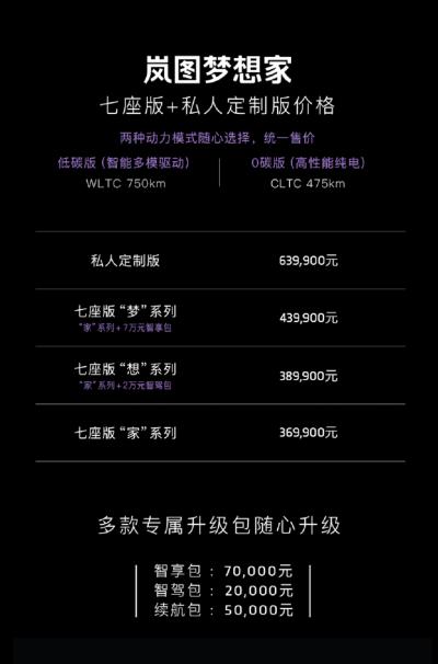 据官方发布,岚图梦想家分为“梦”系列、“想”系列、“家”系列,其中:“家”系列369,900元,“想”系列389,900元,“梦”系列439,900元,私人定制版售价639,900元起。用户可通过岚图汽车APP预订,预计将于今年第三季度起开启交付。梦想家首任车主享受首年免费保险等六大尊享服务权益、终身整车质保等六大无忧权益、三重礼遇专享等福利。
