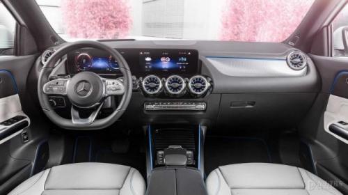 进入车内,新车采用带有数码感的透光饰板,搭配双10.5内嵌MBUX交互系统,支持3D智能导航系统,并加入了搜索沿途充电站等功能;而下方三个圆形“航空引擎式”出风口别具一格,搭配蓝色光源与黑色装饰板看起来格外具有调性,而在副驾驶一侧的中控面板上还加入了点阵式蓝色光源面板,进一步凸显EQ专属元素。