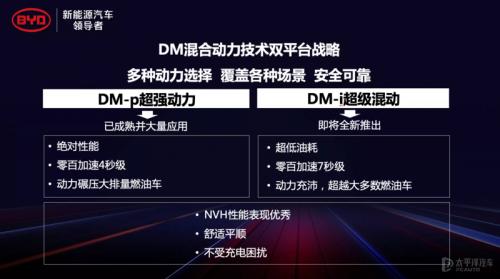 早在2020年6月,比亚迪就已经发布了DM系统双平台战略,其中DM-p(Dual Mode-powerful)系统是主打性能的插混技术,DM-i(Dual Mode-intelligent)系统则是主打节能、高效的插混技术。