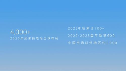按照规划,作为蔚来未来发展主打的换电站,至2025年底,蔚来换电站全球总数将超4000座,其中中国以外市场的换电站约1000座。2021年换电站建成目标总数由500座提升为700座以上;从2022年至2025年,在中国市场每年新增600座换电站。