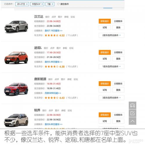 家庭自驾出行的兴起和多孩政策的促使下,7座SUV成为大家的购车对象。在合资中型7座SUV市场上,汉兰达是标杆车型,不过围绕着它有着不少话题,例如刚上市不久要排队等车、然后不能原价提车,甚至整台车设计觉得没什么看点。其实在这个价位可以选的SUV并不少,并且不用享受上面说到的”汉兰达“式待遇。假设消费者的购车预算为25万元上下,那么有哪些7座中型SUV能满足到他们呢?