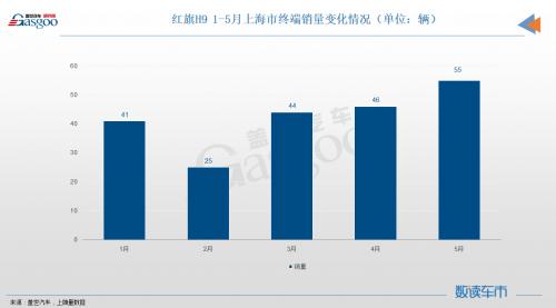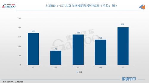 北京是红旗H9市场表现最好的城市。今年前5个月,北京有4个月都是红旗H9的销量冠军城市,而且除了车市整体表现不佳的2月份之外,红旗H9在北京市的月销量均在百辆以上。