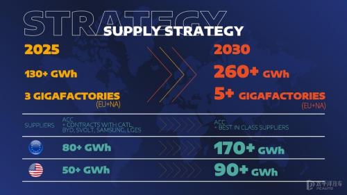 电池产能与采购方面,集团预计2025年能够达到130GWh的电池产量,其中欧洲产量就占80GWh,集团在欧洲当地的电池供应商为ACC(Automotive Cell Company),美国则占另外还有亚洲的供应商包含宁德时代、比亚迪、蜂巢能源、三星SDI、LG Chem等。2030年更会达到260GWh的总量,其中北美与欧洲当地总计会有5座Gigafactory超级电池工厂来供应。