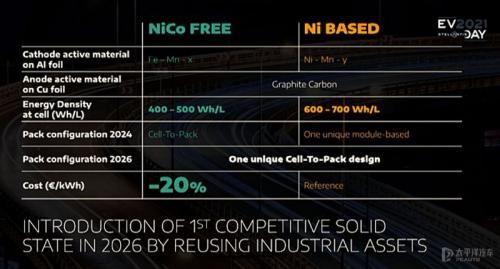 Stellantis集团将在2024年带来2款不同取向的电池组:一种是不含镍与钴元素的锂电池,其能量密度为400~500Wh/L,但每度电的成本可降低20%;另外1款则是含镍、但具有高能量密度的特性,其能量密度可来到600~700Wh/L。另外,到了2024年电池模组的成本将下降达40%、电池管理系统的效率提高4%;到2026年,Stellantis集团还会推出新世代固态电池技术。