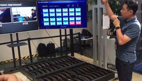 到了总装车间,零部件可以借助人工智能来进行排序实现准确装配——比如X3的内门把手有12种,每个工作人员每天需要做三千次选择——而有了AI辅助之后,零部件会按照装车单的顺序摆放,就不会拿错了。
