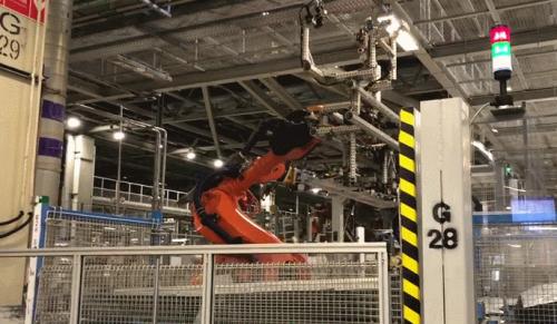 而在一些此前需要人工控制参与的工位,比如侧围部分的抓取,通过5G通信技术(由于高速和短时延的特性,在工业控制上5G非常好用)和视觉系统的结合,取代了工人上线操作(实际上类似的生产线,包括人工工位的安装参数,都要通过两年的虚拟调试和设计,并不是看到的那么轻松)。