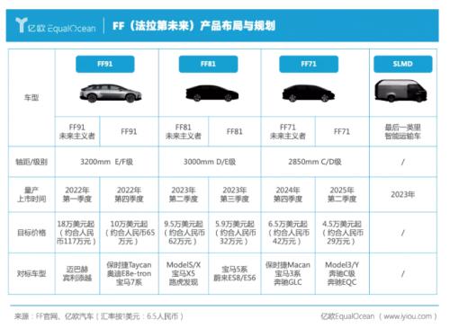 对标蔚来ES8/ES6的FF81交付时间是在2023年,而目前蔚来累计销量已超过10万辆。真正大众性消费的FF71则要等到2024年第四季度交付,与之对标的Model 3/Y单月销量已接近3万辆。