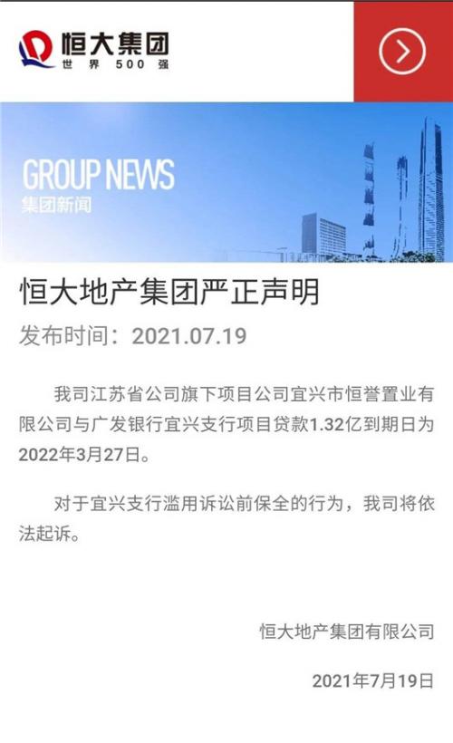 广发银行带来的议论如同潮水一般,涨得快落得也快。恒大集团在官网声明,与广发银行宜兴支行项目贷款1.32亿到期日为2022年3月27日。恒大还声称,将会依法起诉宜兴支行滥用诉讼前保全的行为。