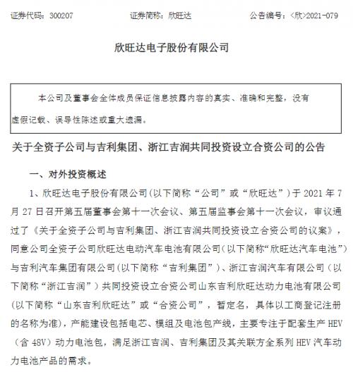 7月28日,欣旺达发布公告称,公司全资子公司欣旺达电动汽车电池有限公司与吉利汽车集团有限公司、浙江吉润汽车有限公司共同投资设立合资公司山东吉利欣旺达动力电池有限公司(暂定名,具体以工商登记注册的名称为准),产能建设包括电芯、模组及电池包产线,主要专注于配套生产HEV(含48V)动力电池包,满足以上两方及其关联方全系列HEV汽车动力电池产品的需求。