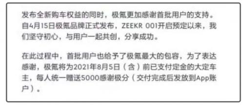 在极氪发布限时尊享权益的同时,也同时大手笔回馈首批大定用户:极氪不仅推出了新的销售政策,同时也感恩首批下定用户。极氪决定对于2021年8月5日(含8月5日)前,支付定金的大定Z客伙伴每人统一发放5000感恩极分(交付完成后发放到APP账户)。
