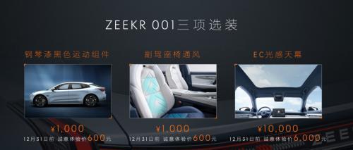 另外,对于首款产品ZEEKR 001,极氪也充分回应极氪车友们的需求,公布了大家非常关心的的三项选装配置价格。三项选装配置分别为钢琴漆黑色运动组件、副驾座椅通风、EC光感天幕。而最让人意外的也是开放电驱品牌选择,这项绝对是是前无古人后无来者的操作。