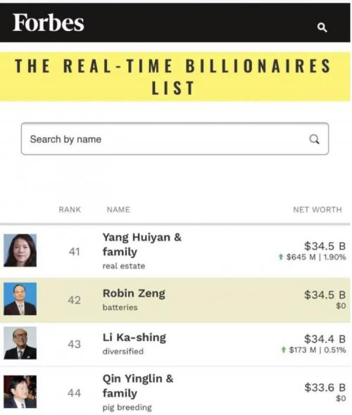 而根据福布斯实时富豪榜数据显示,从5月4日起宁德时代(300750)董事长曾毓群个人资产悄然超越了李嘉诚,以345亿美元的身价排名富豪榜第42位,李嘉诚以344亿美元排名第43位。