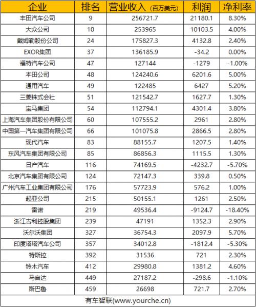 放眼这25家整车制造类公司,中国公司占了其中6家,国际汽车公司19家。在国际汽车公司中,欧洲大牌车企延续了一贯的稳定表现,共有6家企业入围,其中排名前60位的就有4家;而日本车企在今年的表现也相当亮眼,共有6家车企入围,与欧洲车企在数量上分庭抗礼,且丰田以超越第二名大众两倍的利润位居世界车企首位;美国老牌车企福特和通用,也凭借庞大的营收规模保住了自己前50的位置;而在近几年大放异彩的特斯拉,也首次出现在了世界500强之列;而韩国的现代、起亚虽然在国内表现低迷,但在世界范围内仍然有着不错的市场地位。