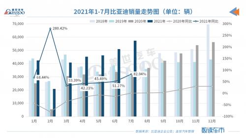 8月5日晚间,比亚迪股份在港交所发布最新销量数据公告。数据显示,其7月新车辆为57,410辆,同比增长82.94%。至此,今年1-7月比亚迪累计销售新车304,099辆,累计同比增长60.04%。