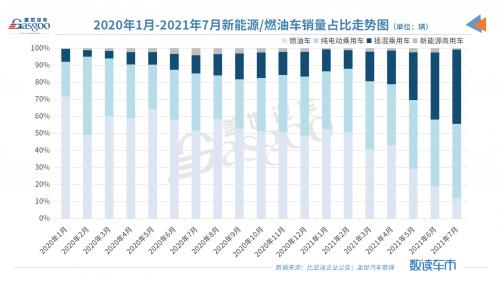 这其中,比亚迪7月插电式混动车型销量占比进一步提升至43.65%,与之对应的是,其纯燃油车销量占比大幅收窄至12.05%。如无意外,比亚迪或成为国内首个实现“禁燃”的传统车企。
