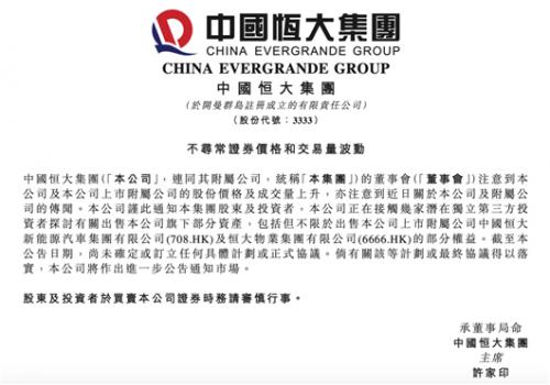 北京时间8月10日傍晚,中国恒大发布公告称,正在接触几家潜在独立第三方投资者探讨有关出售公司旗下部分资产,包括但不限于出售中国恒大上市附属公司中国恒大新能源汽车集团有限公司及恒大物业集团有限公司的部分权益。