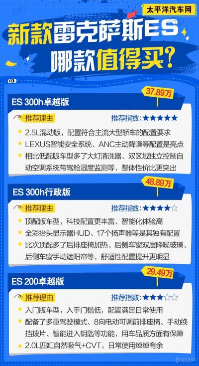 雷克萨斯背靠丰田,拥有较为稳定且良好的产品质量,而雷克萨斯ES(询底价|查参配)也是其在中国的热销车型之一。虽然与BBA那三位相比雷克萨斯ES还差点“味道”,不过它一直都默默坚持自己的造车哲学,对豪华、舒适有着独到的见解,这也是它在面对德系“三剑客”时的杀手锏。日前,新款雷克萨斯ES正式上市,共推10款车型,官方指导售价为29.49-48.89万元。哪款车型最值得入手?下面,我们一起来研究一下。