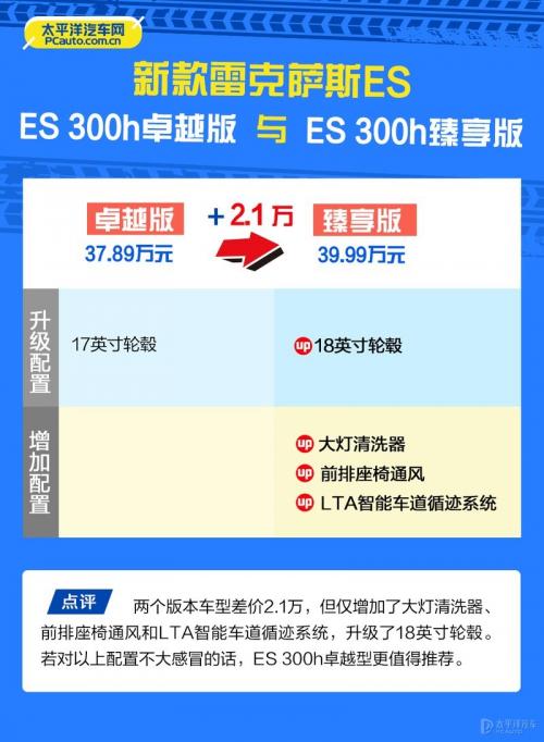 两个版本差价2.1万,但仅增加了大灯清洗器、前排座椅通风和LTA智能车道循迹系统,升级了18英寸轮毂。若对以上配置不大感冒的话,ES 300h卓越型更值得推荐。