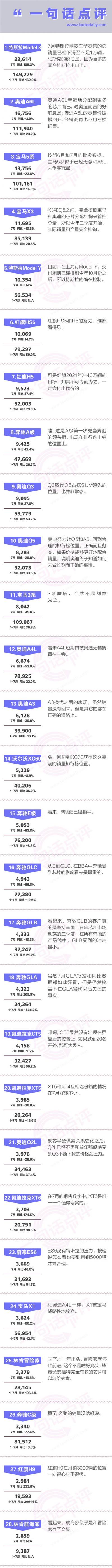 市场概述:7月豪华车的跌幅达到12.2%,这是排除去年疫情一季度的特殊情况之下,近年来豪华车市场的首次下跌,包括BBA在内的大多数的品牌都在下跌,如果再扣除特斯拉出口海外的2万辆销量,7月豪华车的国内批发跌幅有可能达到惊人的20%以上。