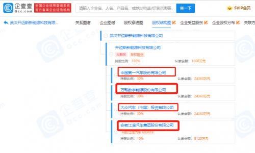 企查查股权穿透显示,该公司由开迈斯新能源科技有限公司(以下简称“开迈斯”)全资持股。后者由大众汽车(中国)投资有限公司、中国第一汽车股份有限公司、万帮数字能源股份有限公司、安徽江淮汽车集团股份有限公司以3:3:3:1的持股比例组建。