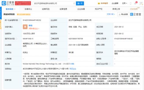 企查查APP显示,近日,武汉开迈斯新能源科技有限公司(以下简称“武汉开迈斯”)成立,法定代表人为曹嘉,注册资本为1000万元人民币,公司经营范围含新兴能源技术研发;电动汽车充电基础设施运营;集中式快速充电站;智能输配电及控制设备销售;数据处理和存储支持服务;大数据服务;区块链技术相关软件和服等。