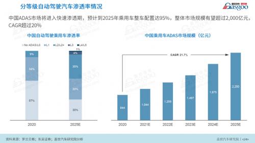 盖世汽车研究院结合行业发展大势做出的预测显示,中国ADAS(辅助驾驶系统)市场已经进入快速渗透期,到2025年预计乘用车整车装配率将高达95%。