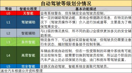 全球市场上,对自动驾驶的分级,目前基本沿用的都是SAE International (国际自动机工程师学会)在2018年发布的《标准道路机动车驾驶自动化系统分类与定义》(以下简称标准)。标准中将自动驾驶从L0到L5分了6个等级,其中L0是没有智能系统介入的完全驾驶员控制,L1-L5则是根据智能化程度做的等级区分。