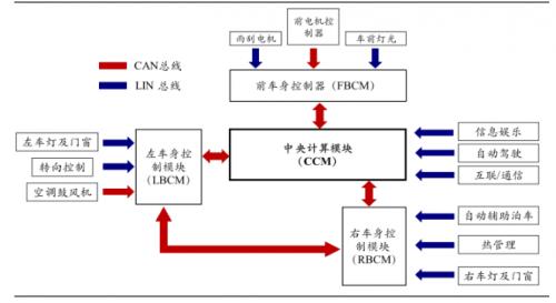 开源证券资料显示,在特斯拉Model3的架构中,配置有一个中央计算模块及三个区域控制器,这三个区域控制器分别为前车身控制模块、左车身控制模块和右车身控制模块。