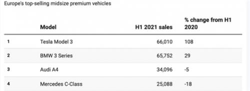 进入全新一年,在经历的短暂的相对低迷,3月特斯拉Model 3位于欧洲市场,重新交出了24,184辆的销量表现。而整个上半年,其位于整个欧洲的累计销量达6.6万辆,同比增长了108%,成功超越宝马3系、奥迪A4、奔驰C级,三位传统燃油车板块最大的竞争对手。