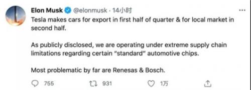 几天前,马斯克曾位于个人社交平台吐槽:“正如公开披露的那样,我们的新车正在某些标准芯片的极端供应限制下运作,目前问题最大的,是瑞萨、博世。”