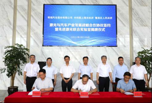 8月29日,奇瑞汽车股份有限公司(以下简称“奇瑞”)、中国科学院上海光学精密机械研究所(以下简称“中科院上海光机所”)和芜湖市繁昌区人民政府签订三方战略合作协议,共同推进激光技术研究及其成果在汽车产业的应用。作为战略合作重要成果之一的奇瑞汽车——中科院上海光机所“先进激光联合实验室”也于当天正式揭牌。
