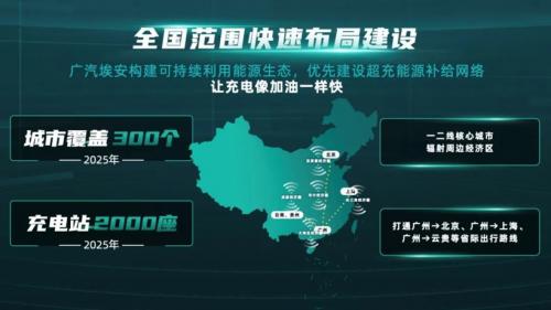 在可持续利用能源生态上,广汽埃安将打造能源补给生态和电池循环生态,推进“公共快充+家用慢充”的网络布局,重点以A480超充桩为核心,推进超充站建设,预计到2025年将建成埃安超充站2000个,覆盖全国300城。同时全力推进电池梯次利用的技术和产品开发,建立上下游产业链的协同发展。