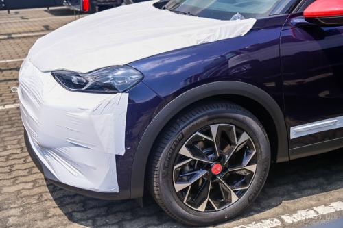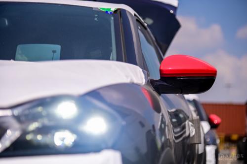从车身侧面可以看出,红色后视镜的设计和车身颜色形成了色彩冲击,加上18寸亮黑色轮毂,给人一种酷炫感和力量感。