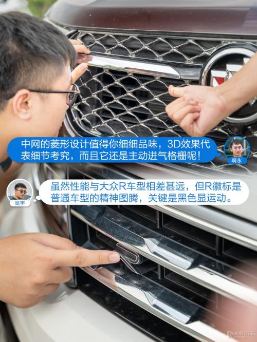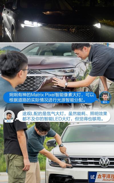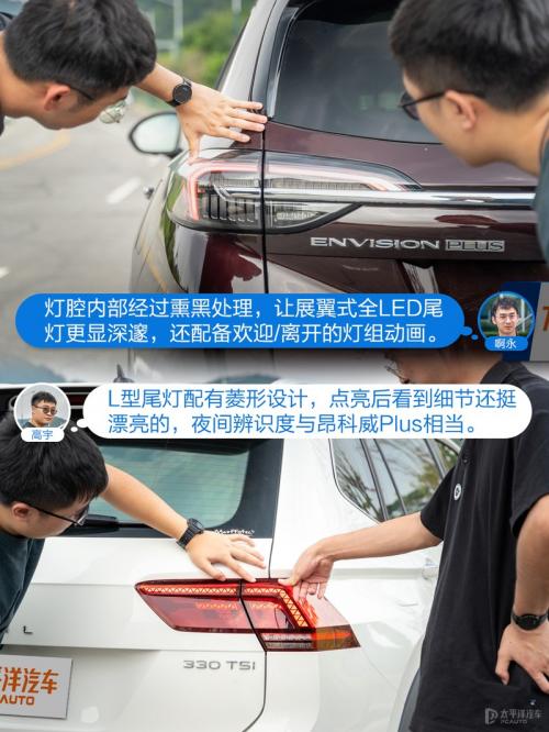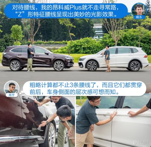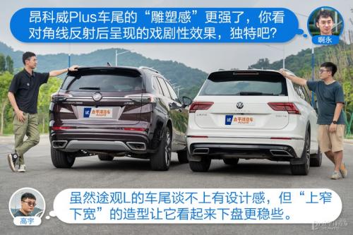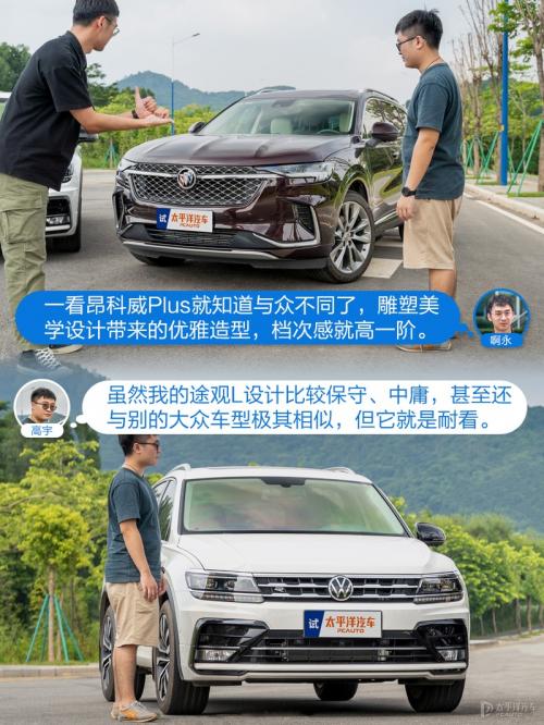 将两款车型放在一起的时候,啊永和高宇都表示昂科威Plus要更精致、高级一些,而途观L有赖于横向设计元素,视觉上会显得更宽。昂科威Plus采用悬浮式立体造型设计,不同的形面描绘出独特的光影效果,看起来就感觉与众不同。途观L延续家族硬朗的线条,勾勒出力量感,虽然设计上让人感觉“过于理性,缺少感性元素”,但不妨碍它成为耐看的造型设计。