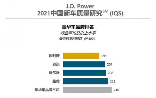 保时捷(199个PP100)荣获豪华车品牌新车质量第一名。奥迪(207个P100)和沃尔沃(208个PP100)分列豪华车品牌第二和第三名。
