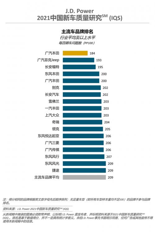 广汽本田(184个PP100)蝉联主流车市场新车质量第一。广汽菲克Jeep(193个PP100)排名主流车第二,长安福特(195个PP100)排名第三。
